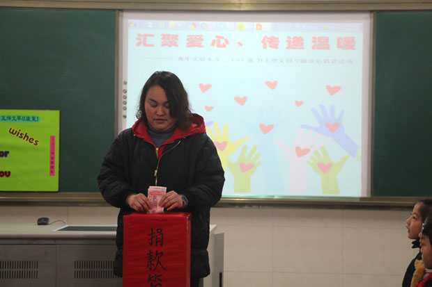 2019年1月15日清晨,窗外寒风刺骨,室内却暖意融融,爱潮涌动!奔牛实小三(3)班的学生们早早步入教室,他们自发为本班患重病的王烨文同学献爱心捐款!除了本班任教的潘晓萍、祁洁萍和史碧云三位老师,听闻王烨文病重消息的学校领导、部分热心家长和李庭英老师也都从百忙之中赶来参加了这次活动。