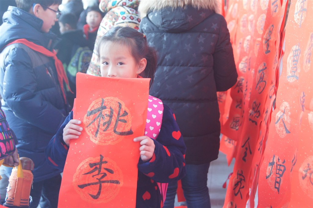 下午2点半,红彤彤、飘着清新墨香的春联相继挂满了学校长廊。书法达人们有劲地挥毫书写,随着毛笔的挥动,或娟秀,或精致,或大气,或奔放的毛笔字在鲜艳的红纸上逐一呈现,隶书、楷书、行书各不相同,都是行云流水、端庄秀丽。周围的老师、学生、家长渐渐多了起来,他们一面欣赏墨宝,一面凭爱心券换取心仪的春联。 “福星高照全家福,春光耀辉满堂春”、“宝贵三春景,平安二字金”、“一帆风顺全家福,万事如意满门春”、“门庭多喜气,山水遍春光”…… 一张张满意的笑容,一副副满载祝福的寄语,融进了学生、老师、家长的心坎。活动中既可以取得春联,又能为孤寡老人送去温暖,形成了一道饱含爱意的独特年景。