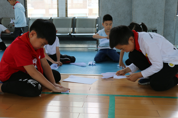 小选手们要用70克A4纸在5分钟内折叠出2架机身长度不小于15厘米,翼展宽度不得小于4厘米的纸飞机,比谁的飞机飞的直线距离长。比赛开始了,选手们熟练地开始折飞机,大家发挥自己的聪明才智,折出形状各异的纸飞机,有的是长长的,像一杆标枪;有的是宽宽的,三角形的;有的是仿真战斗机,可好看啦!