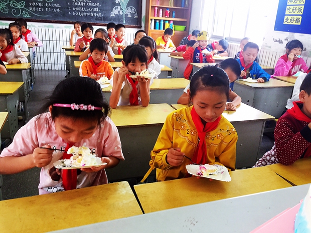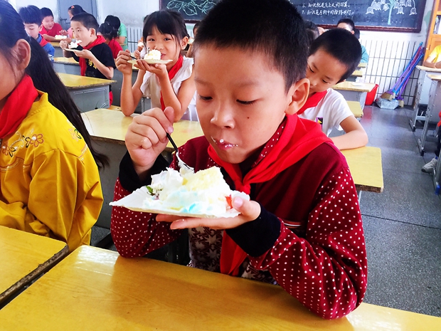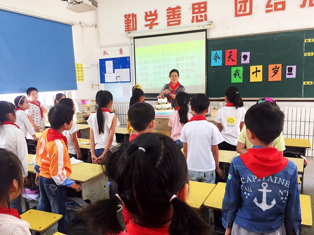 班里的王子岳同学刚好是今天生日,孩子的父亲一大早就送来了一个三层大蛋糕,班主任杨老师趁机给全班学生过了个十岁集体生日。活动中,孩子们齐声朗读诗歌《今天,我十岁》。每组选代表读来自父母的信,再次追忆自己成长的足迹,感受到父母对他们无微不至的爱,感受到父母对他们的期望。还宣读了《十岁成长宣言》。最后,老师和孩子们点燃蜡烛,唱生日歌,吹蜡烛,分享蛋糕,让全体学生度过了一个难忘的集体生日。