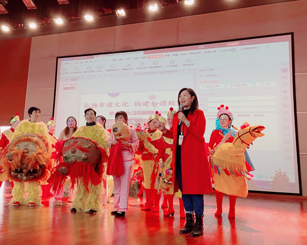 叶茹阿姨先为孩子们普及戏曲的相关知识,认识戏曲中的角色和服饰。接着精彩纷呈的舞龙舞狮、别具风味的花挑舞、边跳边舞的跑马灯、活泼可爱的大头娃娃、吸睛无数的荡湖船、一张一合的“蚌壳精”等非遗代表性项目一一展现在师生面前,孩子们大饱眼福,目不转睛。