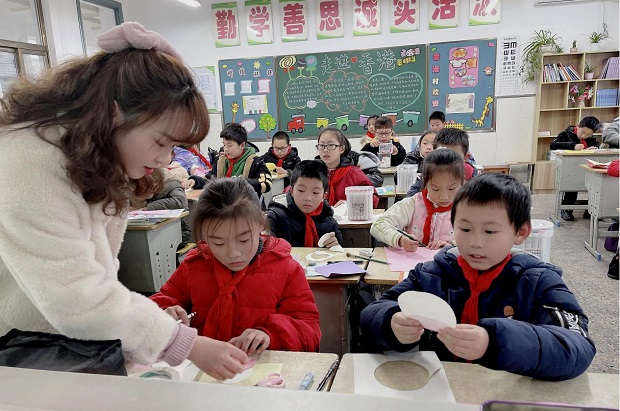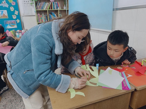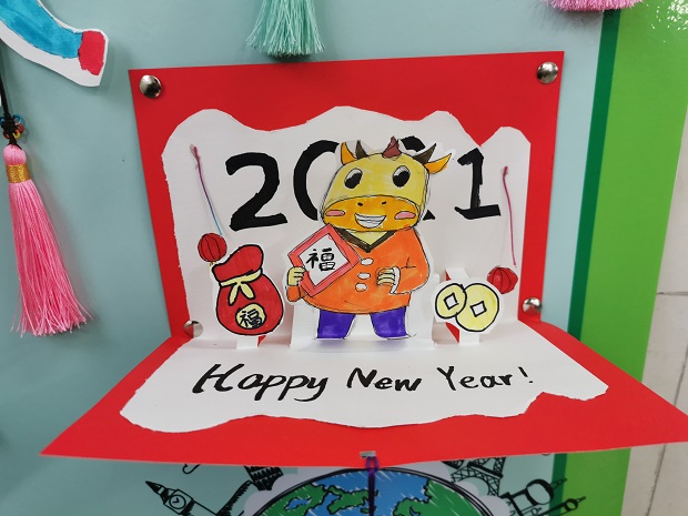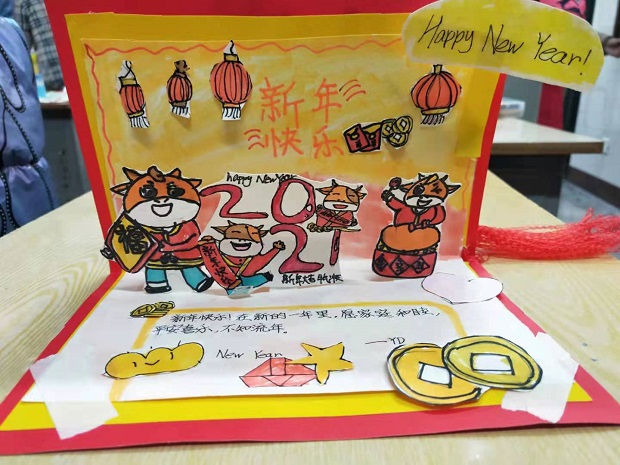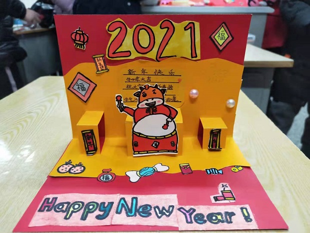 高年级的课程主题是“牛气冲天”,同学们在老师的指导下,以贺卡和小挂件的形式为载体,寄托了对牛年的祝福。在课堂上,孩子们一个个都聚精会神,兴趣高昂地在制作自己的新年贺卡与小挂件。
