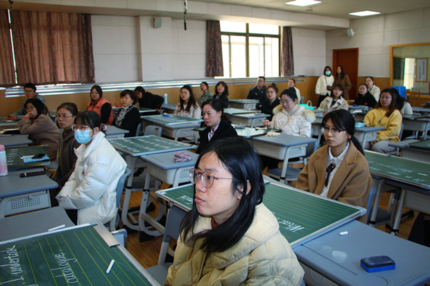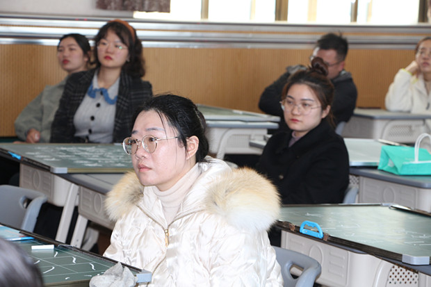 书法老师刘雁,是中国书法家协会高级注册教师,其作品曾获“北京大学”全国美术书法大展特等奖,全国汉字书写大赛金奖等。刘雁老师精心准备,边演示边讲解,先给大家介绍了汉字基础笔画的分类,接着就粉笔的特性,指导大家巧妙使用粉笔来表现汉字虚实、强弱、粗细变化等特点,最后通过“永”字八法,给大家讲解了汉字的结构。老师们认真聆听,随后开始试着书写。短短一支粉笔,在老师们的手中似乎具有了魔力,黑板上刹那间盛开出朵朵灿烂的梨花。刘老师对老师们的现场书写进行了耐心指导和点评,指出了老师们书写中存在的问题和改进方向,大家受益匪浅。