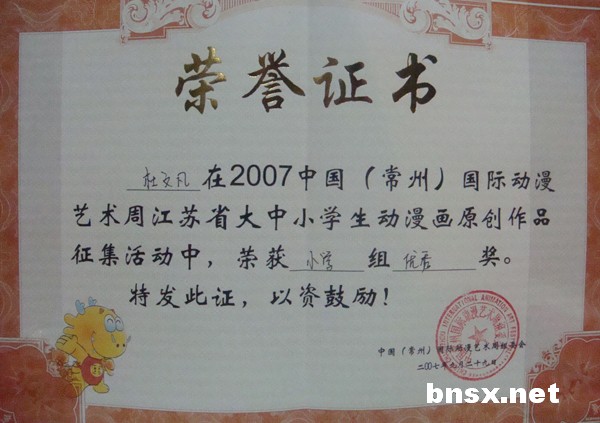在“2007中国(常州)国际动漫艺术周”江苏省大中小学生动漫画原创作品征集活动中,我校现六(4)班奚志豪同学荣获金奖,六(5)班包震宇、陈胜四(6)班周颖分获银奖,六(7)班杜文凡获优秀奖。并于9月29日赴亚细亚影城参加了颁奖仪式。本次活动由文化部中外文化交流中心、江苏省委宣传部、江苏省文化厅、江苏省广播电视局和常州市人民政府共同主办,属2007中国(常州)国际动漫艺术周系列活动。