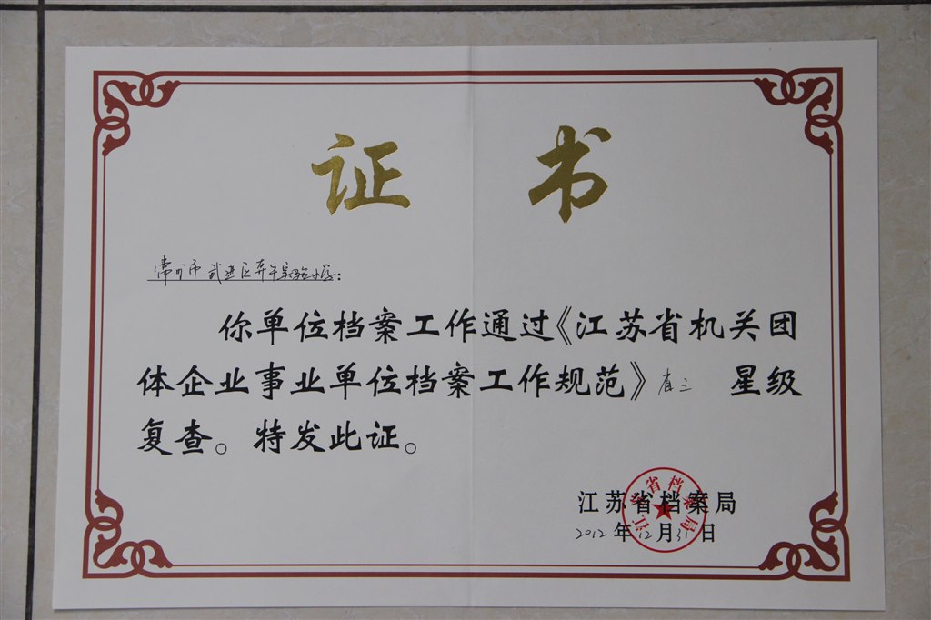 (2012年12月底,我校档案室荣获省三星级复查证书)