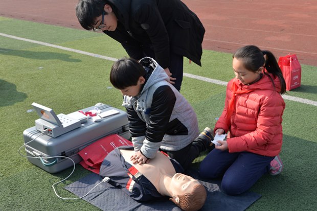 操场,来自江苏常州市晨宇科普培训有限公司的专业救护人员带着人体模型,手把手亲自教学生们如何抢救突发病患者。救护人员说到:“孩子们,现在你们看到的这个只是模型,或许你们觉得这个没什么,倘若现在躺在这里的真的是你的亲人、你的朋友,哪怕只是一个路人,你有了紧急救护的技能之后,就可以发挥你的一己之力了。”听着救护人员的讲解,学生们学的尤其认真,“按压、吹气”一把一把的用力按压,连接人体的数值显示,人体体征由“死亡”变为“安全”,孩子们急救成功了!