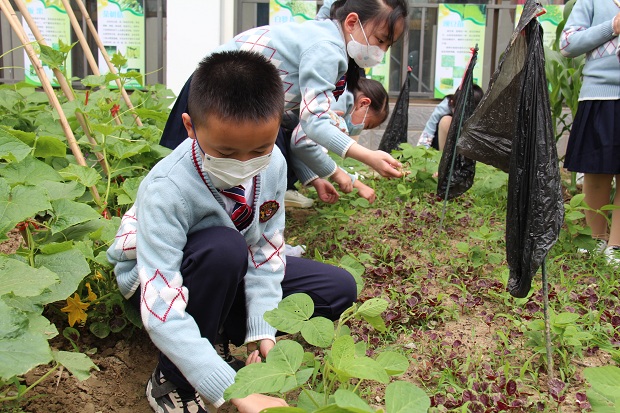 田间除了蔬菜瓜果,总是有来“抢食”的客人——杂草。在指导老师耐心细致的讲解和示范下,孩子们了解了如何分辨和处理杂草。劳动中,孩子们化身为一个个小菜农,不怕脏不怕累。双手沾上了泥土,拍一拍;白色的球鞋蹭到了泥土,跺一跺,还乐呵呵地说道:“脏了我可以回家自己洗。”