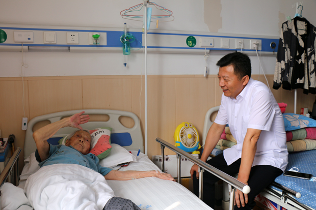今年已经95岁高龄的杨老正卧在病床上输液,她看到“娘家人”的到来,感慨万分,热泪盈眶。校领导与她亲切交谈,关切地询问她的近况,得知杨老是由于年后不慎摔了一跤,已经卧床休养了近半年。杨校长嘱咐杨老一定要注意休养,多保重身体,并祝愿她健康长寿。