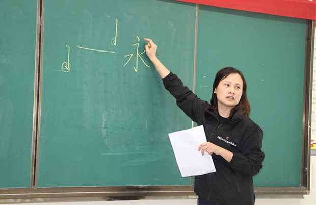 本次培训特邀书法老师刘雁来校指导,刘老师是中国书法家协会高级注册教师,其作品曾获“北京大学”全国美术书法大展特等奖,全国汉字书写大赛金奖等。刘老师以专业的视角先带大家认识了粉笔的特性,学习如何使用粉笔;接着例举了汉字的基础笔画,选择典型笔画进行示范分析;最后通过“永”字八法讲解结构,让教师随堂试着书写,解析改正。