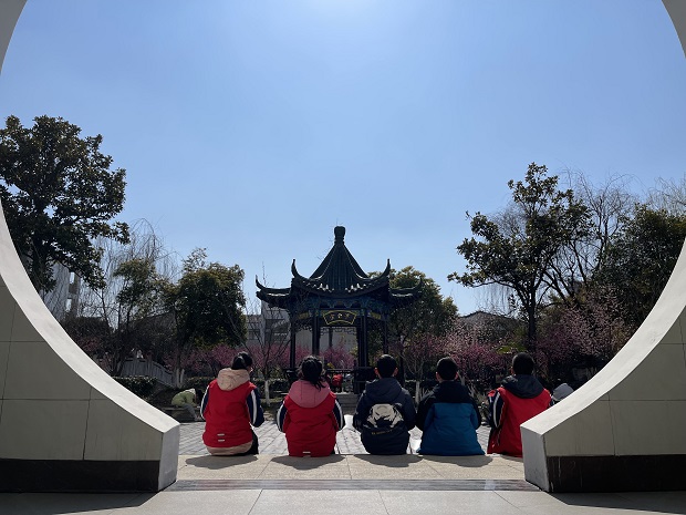 碧空如洗,沐浴暖阳,孩子们三三两两坐在草地上写生。远处的亭台楼阁、钟楼错落有致,湖面上荡起层层涟漪,小桥边掠过青春的身影——这是奔牛实验小学的一节美术课,校园里美丽的园林风景写生。