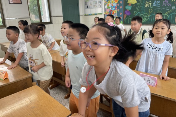 “老师好!”“同学们好!”……在一声声温暖的问候中,孩子们的小学生活温柔启航。班主任早早布置好教室,黑板上的欢迎画、课桌上的欢迎旗,都是给孩子的第一份温柔礼物。他们勇敢地站上讲台,大声说出自己的名字和爱好“我喜欢画画!”“我爱踢球!”从这一刻起,他们正式成为奔牛实小温暖大家庭中的一员。