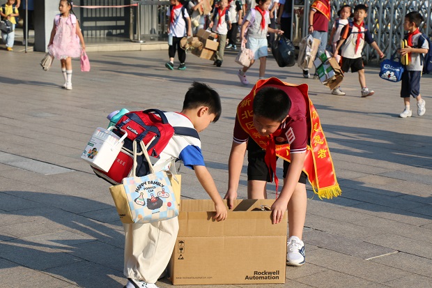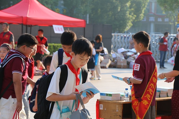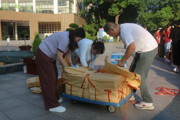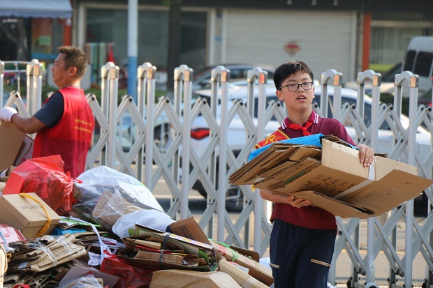 早晨,学生陆续来到学校“绿色驿站”,将一袋袋沉甸甸的废纸进行分类投放。学校环保志愿者与党员教师们一起行动,对废纸进行分类,并分发家校练习本。他们动作熟练、配合默契,俨然一支专业的“绿色小分队”。废纸虽轻,积善成德;绿色虽小,聚木成林。天气的炎热挡不住大家对环保事业的支持与热爱,这一刻,每一张纸都承载着师生们对地球的关爱与责任。