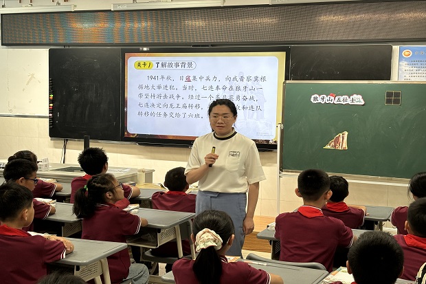 李明老师以“电影拍摄”为创意载体,开展《狼牙山五壮士》教学,让红色课堂焕发生机。课堂伊始,李老师借“寇”字字形解析,帮学生理解“日寇”含义,再播放《南京照相馆》视频,筑牢学生对故事背景的认知。随后,她引导学生默读课文,提炼“接受任务”“痛击敌人”等五个四字小标题,梳理情节并复述,明晰文章结构。核心环节聚焦“痛击敌人”片段,李老师通过角色代入、关键词品析,让学生感受马宝玉、葛振林等壮士的英勇,还讲解“点面结合”写法的作用。课堂尾声,李老师布置仿写壮士跳崖画面的任务,鼓励学生以文字定格英雄瞬间。此次教学打破传统模式,让红色经典学习更生动,助力学生铭记历史、传承英雄精神。